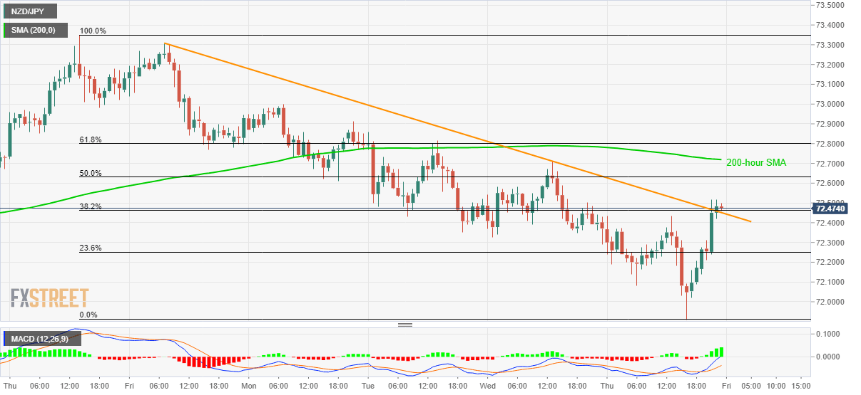 NZD/JPY takes the bids to 72.50 during early Friday morning in Asia. In doing so, the pair crosses a one-week-old falling resistance line. The buyers seem to cheer upbeat data from New Zealand while portraying the recent run-up.