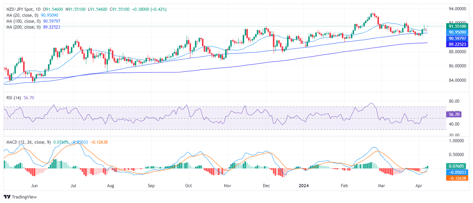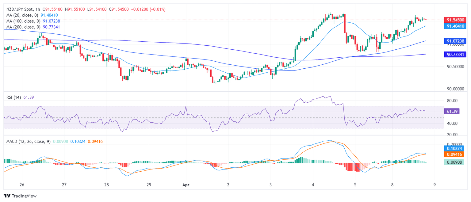 The NZD/JPY pair, currently trading at 91.57, is recording gains of 0.45%, indicative of a reinforced bullish momentum. Positioned above key Simple Moving Averages (SMAs), the bullish sentiment endures, despite intermittent signs of momentum loss on the hourly chart as buyers seem to have already given it all for Monday’s session. Indicators on the daily chart remain positive.