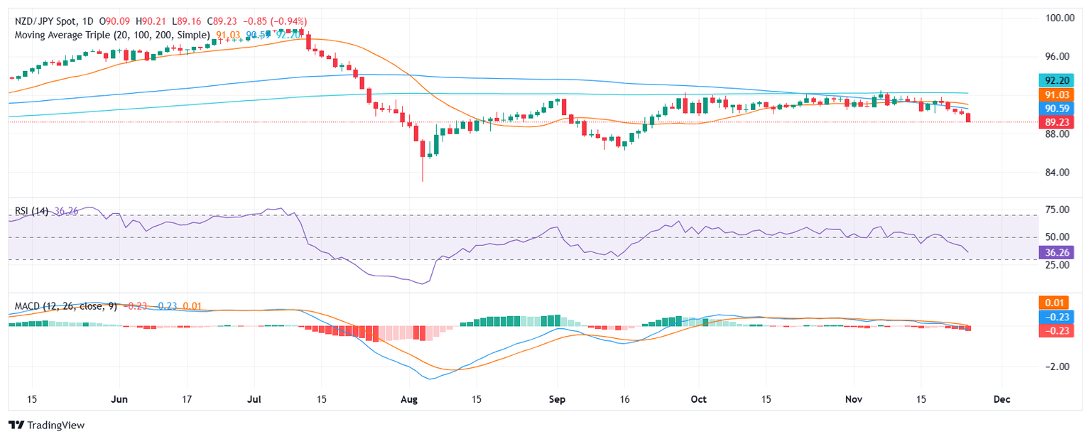 The NZD/JPY pair continued its downward trajectory on Tuesday, falling 0.94% to trade near 89.20. This marked the fourth consecutive day of losses for the pair, bringing it to its lowest level since September 20.