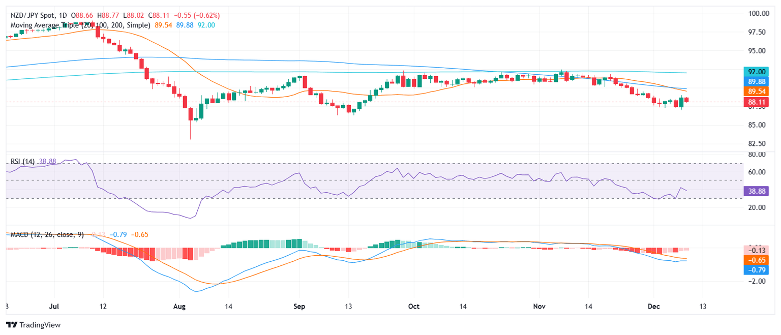 - NZD/JPY declined by 0.69% on Tuesday, settling at 88.10 as selling pressure persists.