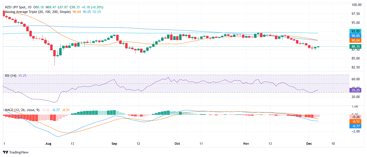 The NZD/JPY cross continued its recovery on Thursday, rising 0.20% to 88.35 as indicators stabilized near oversold conditions. This modest rebound marks a two-day winning streak after the pair fell to the 88.00 region earlier in the week. Despite these gains, the broader outlook remains bearish, with the pair trading well below key resistance levels and moving averages.