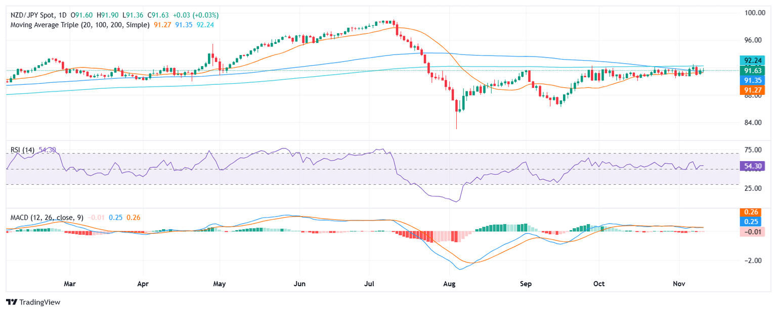 The NZD/JPY rose mildly to 91.65 in Tuesday's session. The pair saw some gains but remains stuck in a clear trading channel between 92.00 and 91.00. A bearish crossover, about to be completed between the 20 and 100-day Simple Moving Average (SMA) might push the pair lower.