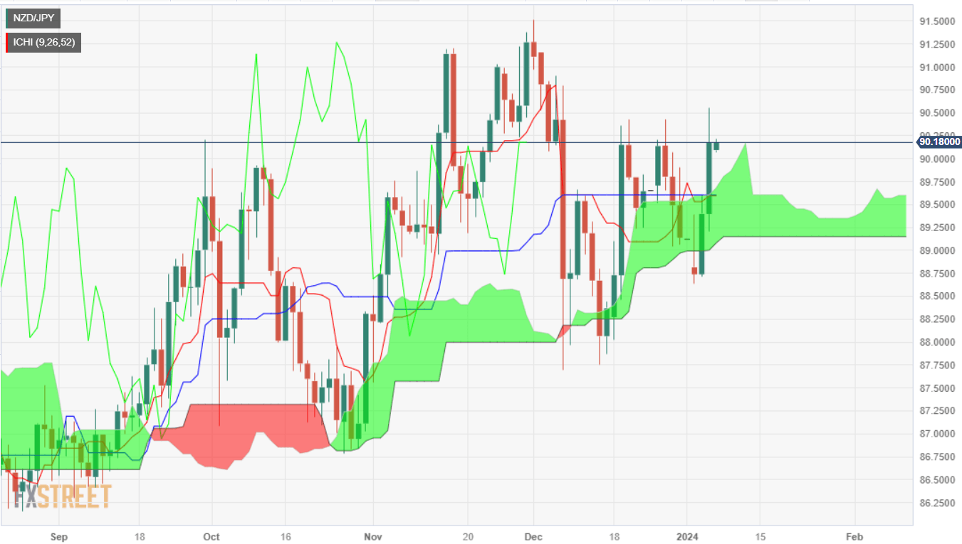 The NZD/JPY soared sharply and posted gains of more than 0.70% on Thursday, courtesy of broad Japanese Yen (JPY) weakness across the board. In doing so, the pair shifted bullish as it broke above the Ichimoku cloud (Kumo), suggesting that bulls are in charge. As the Asian session begins, the NZD/JPY exchanges hands at 90.14, posting minuscule losses of 0.01%.