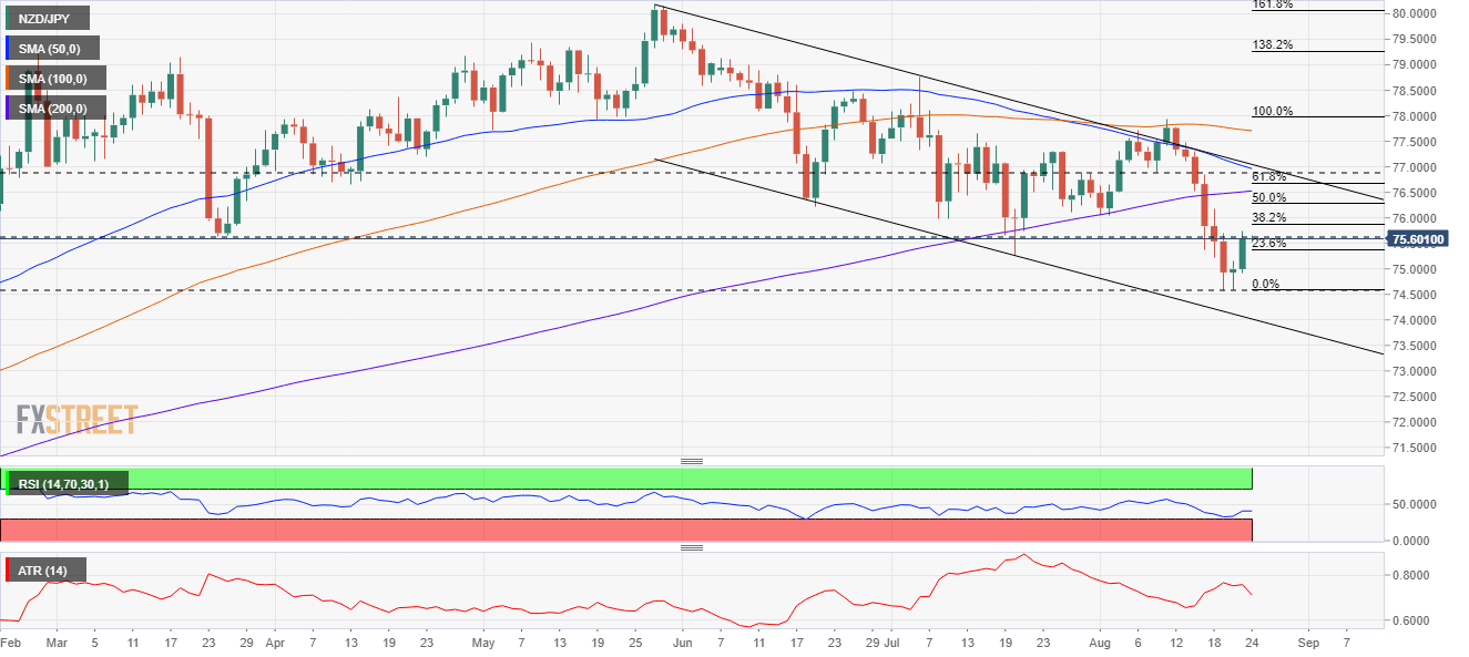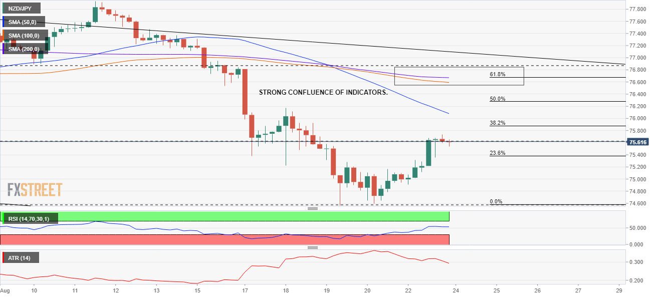 - NZD/JPY is up 0.07% in the early Asian session, eyes 76.00.