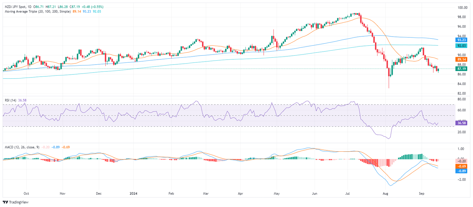 Monday's session saw the NZD/JPY pair rise by 0.60% to 87.20. However, the overall technical outlook for the NZD/JPY remains negative due to the losses seen in the last week as sellers seem to be taking a breather.