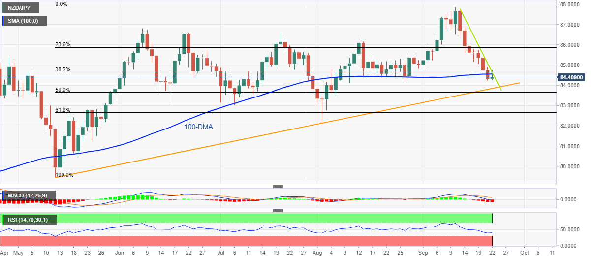 NZD/JPY retreats to 84.40 after a slew of New Zealand data failed to impress the pair buyers during Thursday’s Asian session. In doing so, the cross-currency pair defends the previous day’s downside break of the 100-DMA while also respecting the one-week-old descending resistance line.