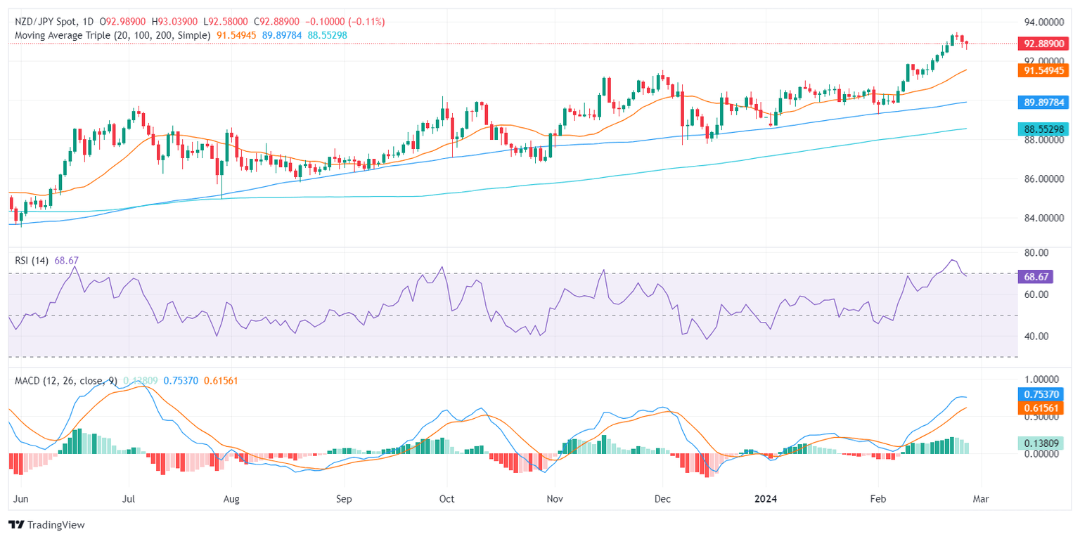 - The NZD/JPY is trading at 92.87, which represents a slight decline of 0.10% during Tuesday's session.