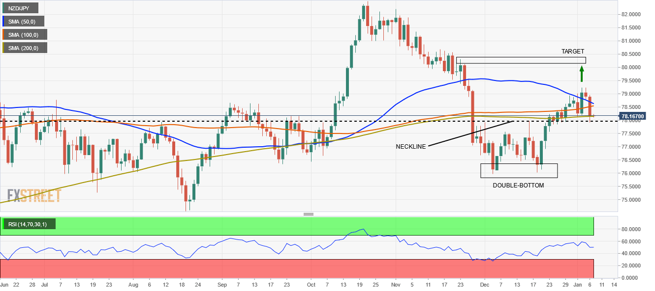 The NZD/JPY first resistance would be the 100-DMA at 78.55, which opens the door for further gains once broken. The next ceiling would be December 30, 2021, daily high at 78.93, followed by the January 4 cycle high of 79.22.