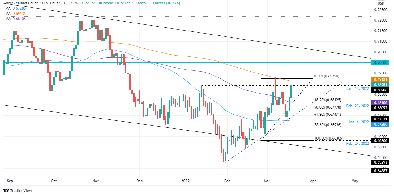 The NZD/USD rallies for the third straight day, erasing most of last week’s losses amid a mixed market sentiment, courtesy of geopolitical concerns, which adds upward inflation pressure, despite efforts of central banks increasing borrowing costs to tame it. At press time, the NZD/USD is trading at 0.6895.