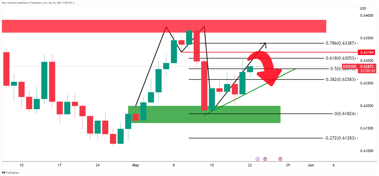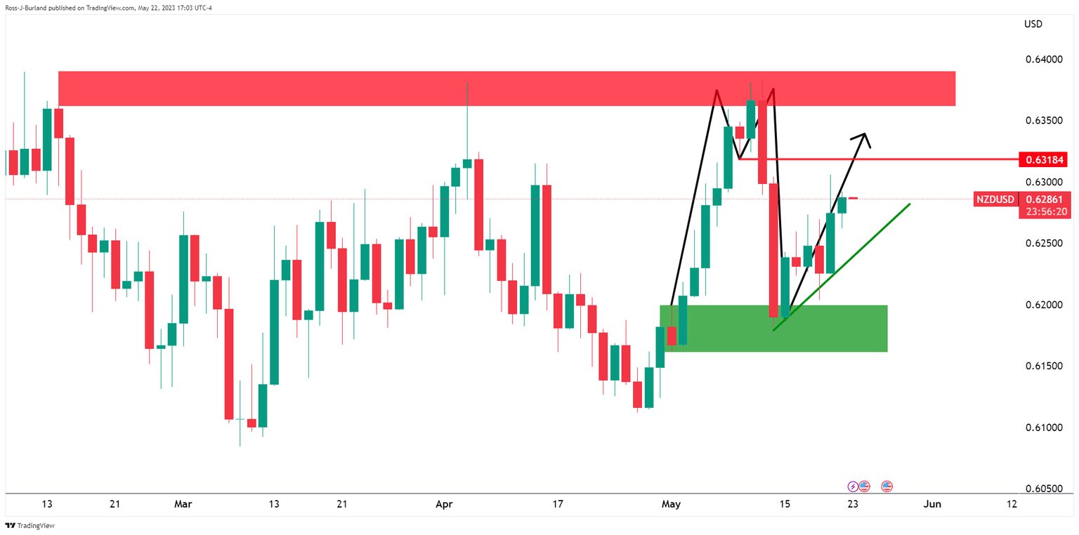 - NZD/USD bulls have been in charge and eye 0.6300.
