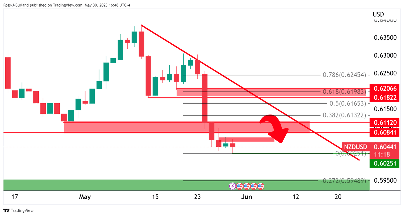 - NZD/USD bears are lurking below the trendline resistance.