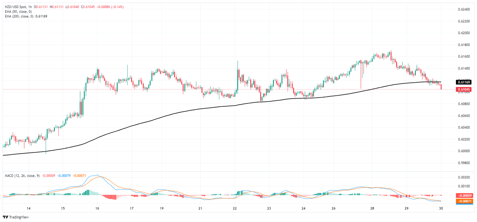 NZD/USD is trading down in the early Thursday market session, drifting towards the 0.6100 handle as broad-market Greeback strength forces down the Kiwi. The pair is heading lower for a third consecutive trading day, and bearish momentum will drag NZD/USD into the 200-day Exponential Moving Average (EMA) at 0.6077.