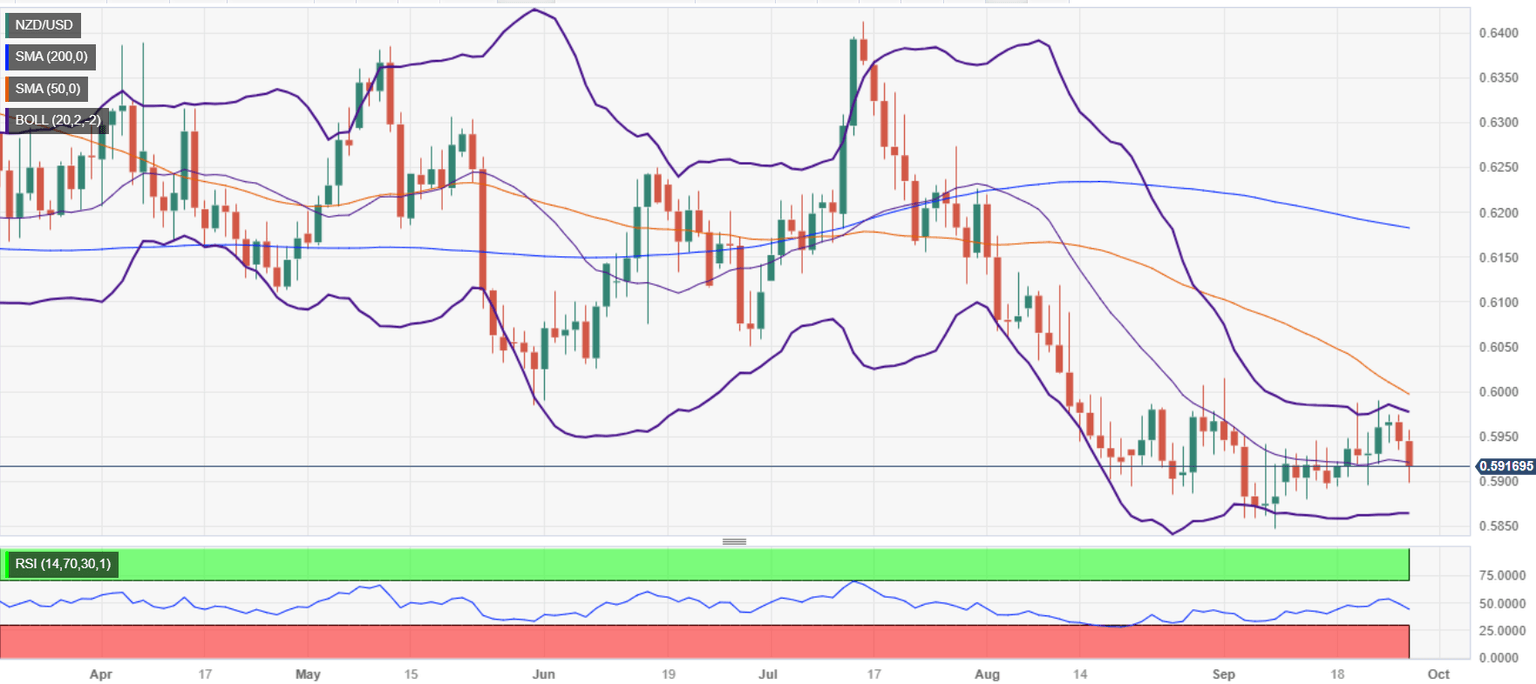After forming a bearish-engulfing candlestick pattern, the NZD/USD dropped to a new four-day low of 0.5899, but buyers stepping at the 0.5900 figure lifted the pair. Despite its bearish bias, the pair must reclaim the September 5 swing low of 0.5859, to register a new cycle low that could extend the downtrend and open the door to challenge the November 3, 2022, low of 0.5740. On the upside, the NZD/USD's first resistance would be 0.5950, followed by the 50-day moving average (DMA) at 0.5996.