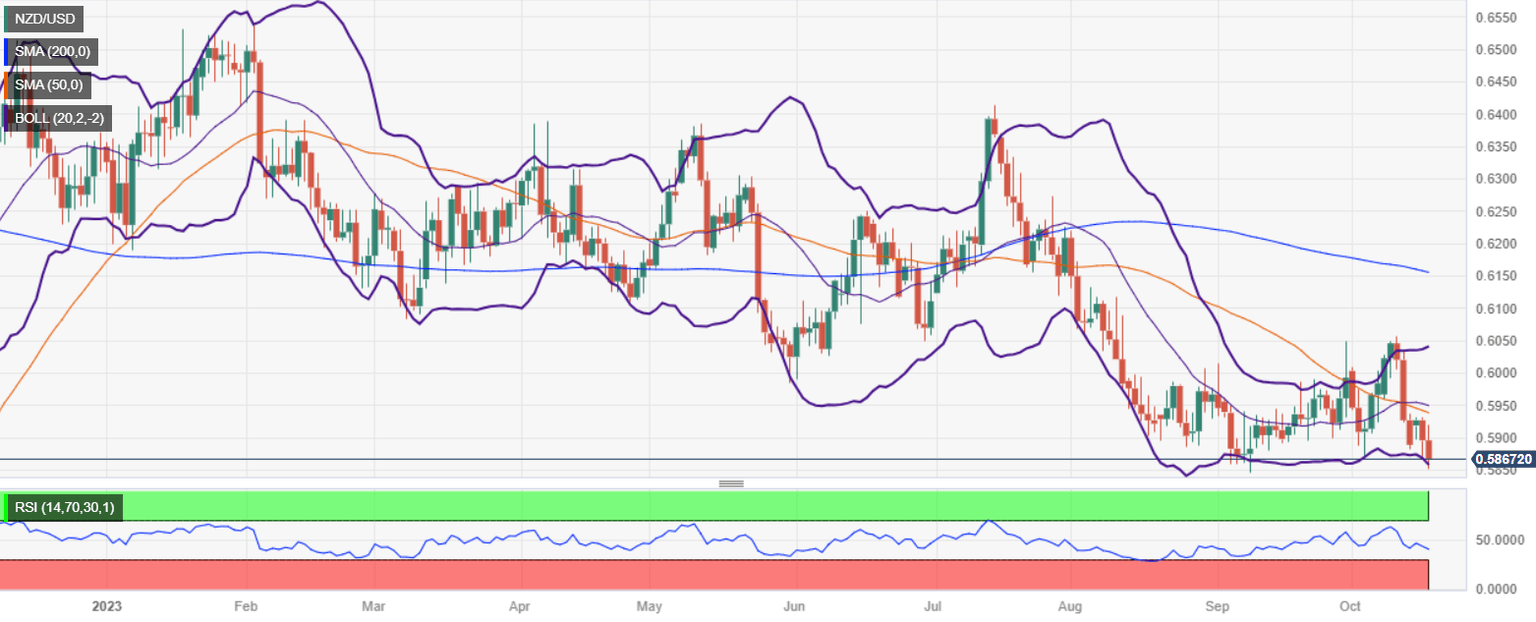 The New Zealand Dollar (NZD) plunged to a new year-to-date (YTD) low of 0.5851 against the US Dollar (USD) on Wednesday, spurred by risk aversion and the jump in US Treasury bond yields. Geopolitical tensions underpin the Greenback to the detriment of high-beta currencies, like the Kiwi Dollar (NZD). The NZD/USD exchanges hands at around 0.5855, down 0.69%.