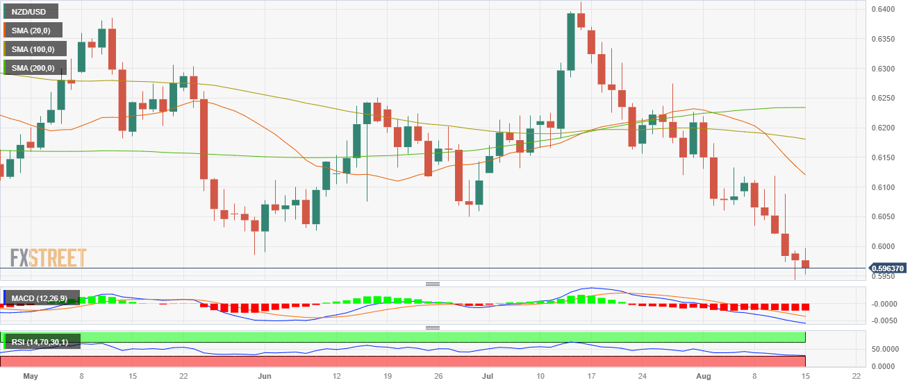 - NZD/USD trades with losses below 0.6000, its lowest in nine months.