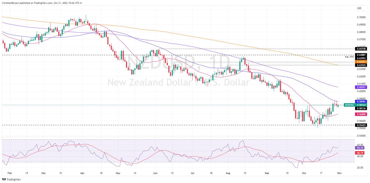 The NZD/USD slightly advanced during the mid-North American session, despite overall US Dollar strength, though the New Zealand dollar, after reaching a fresh three-day low, bounced off and reclaimed the 0.5800 figure. At the time of writing, the NZD/USD is trading at 0.5812, almost flat.