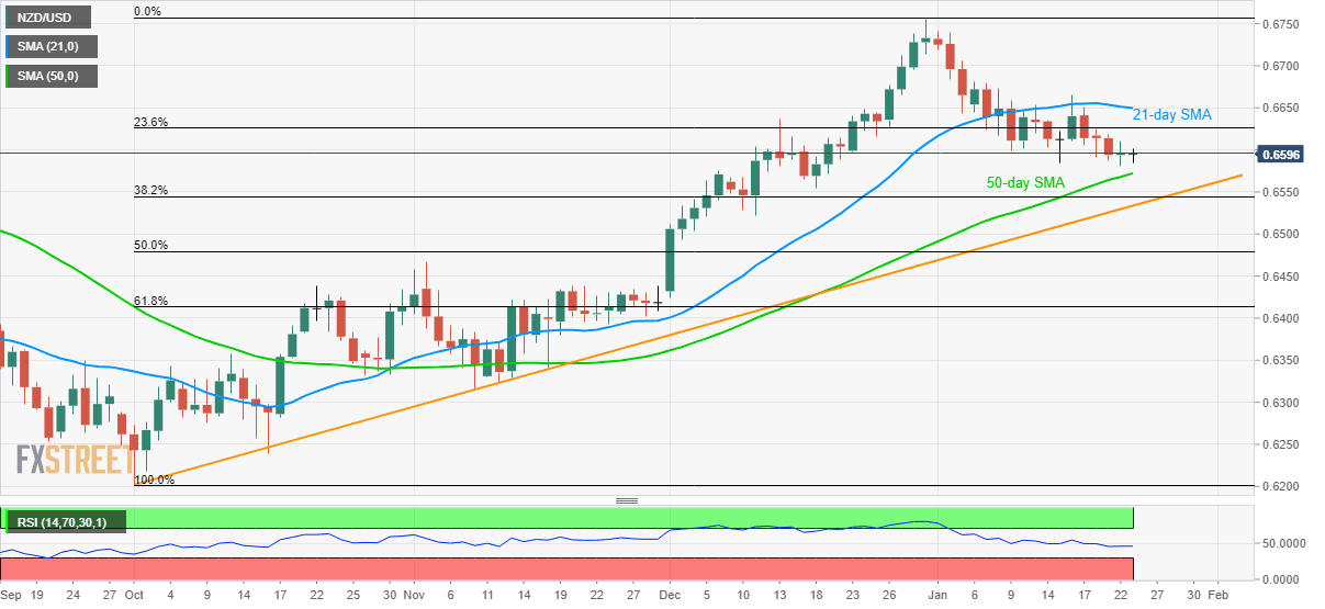 NZD/USD registers the least momentum among majors while taking rounds to 0.6595 during early Thursday. The pair almost posted the Doji candle, if we consider a two-pip move as an exception, on Wednesday, which in turn favors pullback of the previous three days’ decline.
