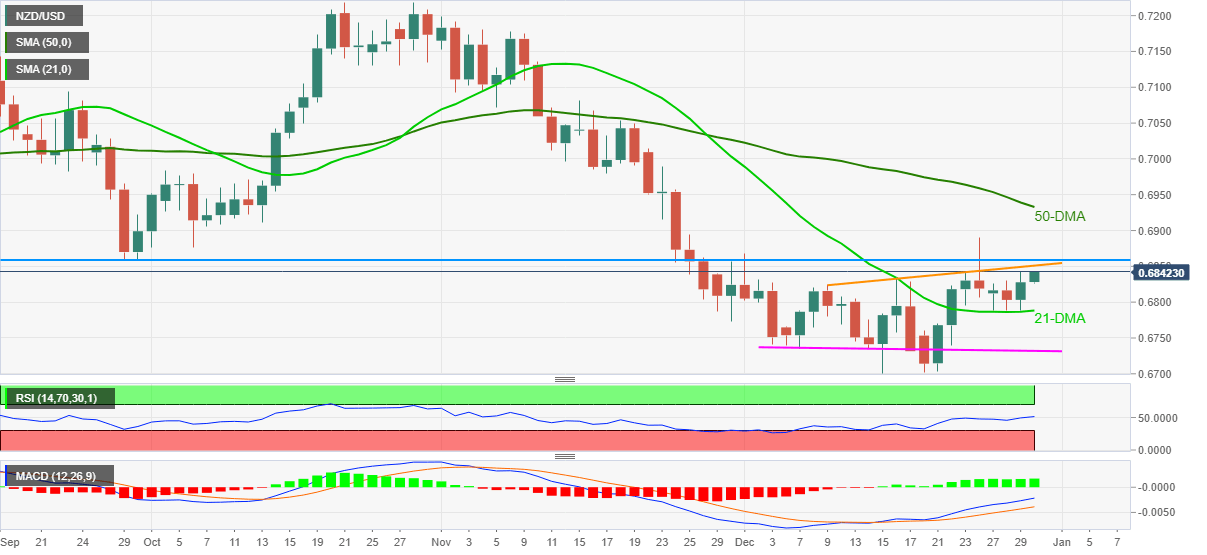 The kiwi pair jumped the most in over a week the previous day while bouncing off 21-DMA. Additionally, bullish MACD signals and firmer RSI to keep NZD/USD buyers hopeful to revisit a three-week-old resistance line near 0.6850.