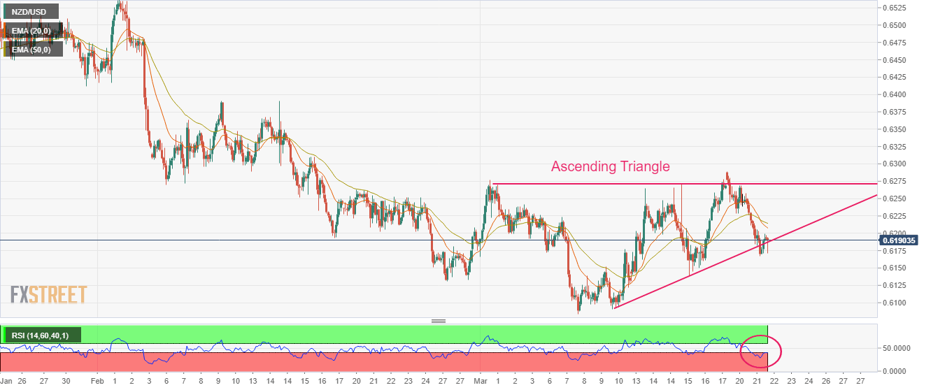 On a two-hour scale, NZD/USD is hovering near the upward-sloping trendline of the Ascending Triangle chart pattern, which is plotted from March 09 low at 0.6105. While the horizontal resistance of the chart pattern is placed from March 01 high around 0.6277.