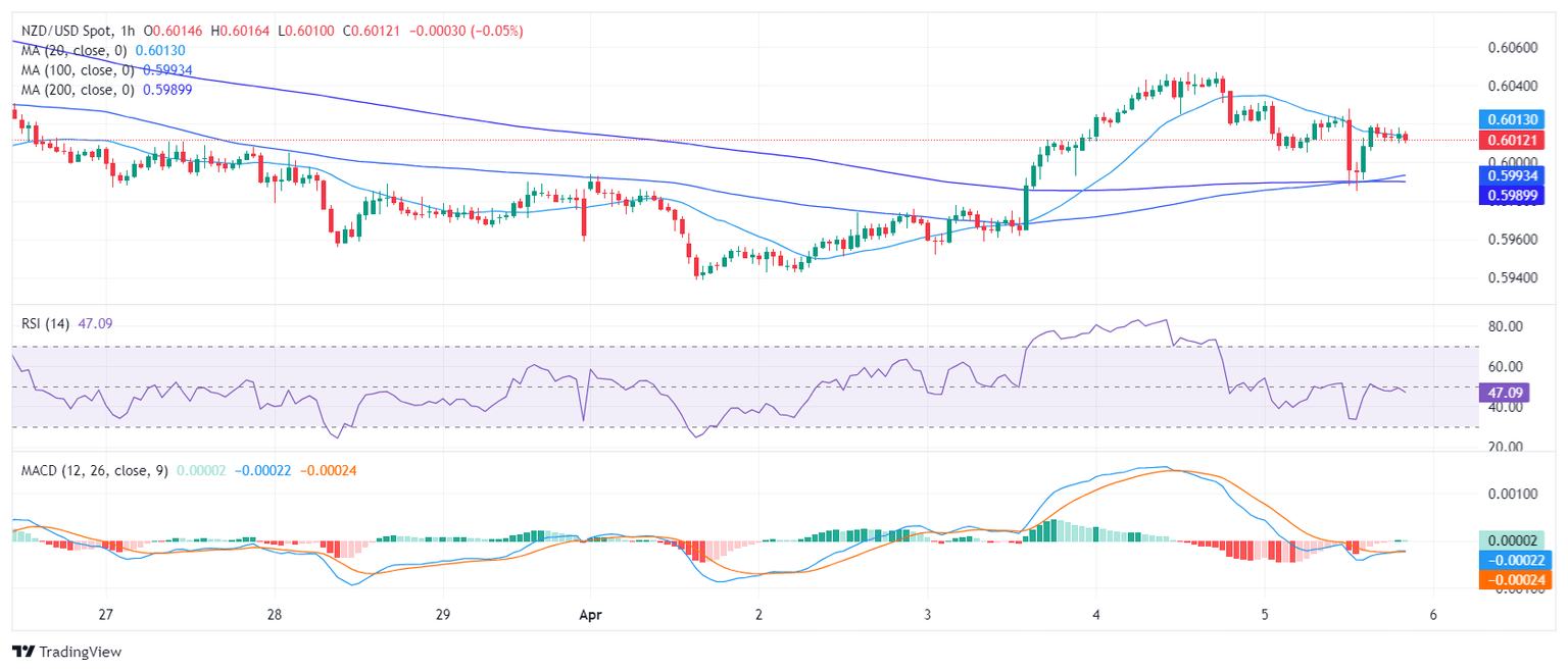 The NZD/USD pair is trading at 0.6013, indicating a drop of 0.26% in Friday's session but will close a winning week. The prolonged downward trend suggests that sellers command the current market. However, the short-term outlook reveals a slight bullish momentum, which could lead to a period of sideways trading in the next sessions.