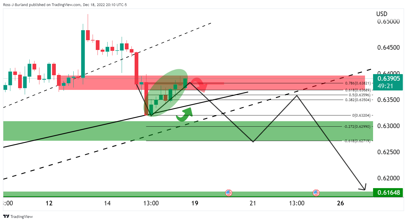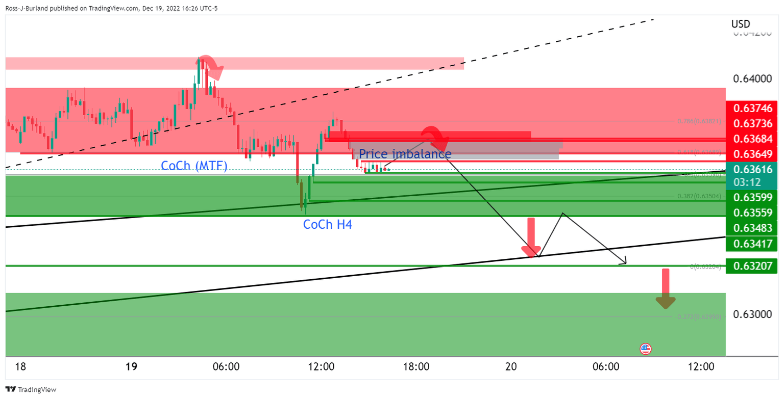 If there are still bears on the sidelines, then they might be lured in at a discount should the price correct back into the resistance area and a price imbalance that has shown up on the 15-min chart between 0.6365 and 0.6373.