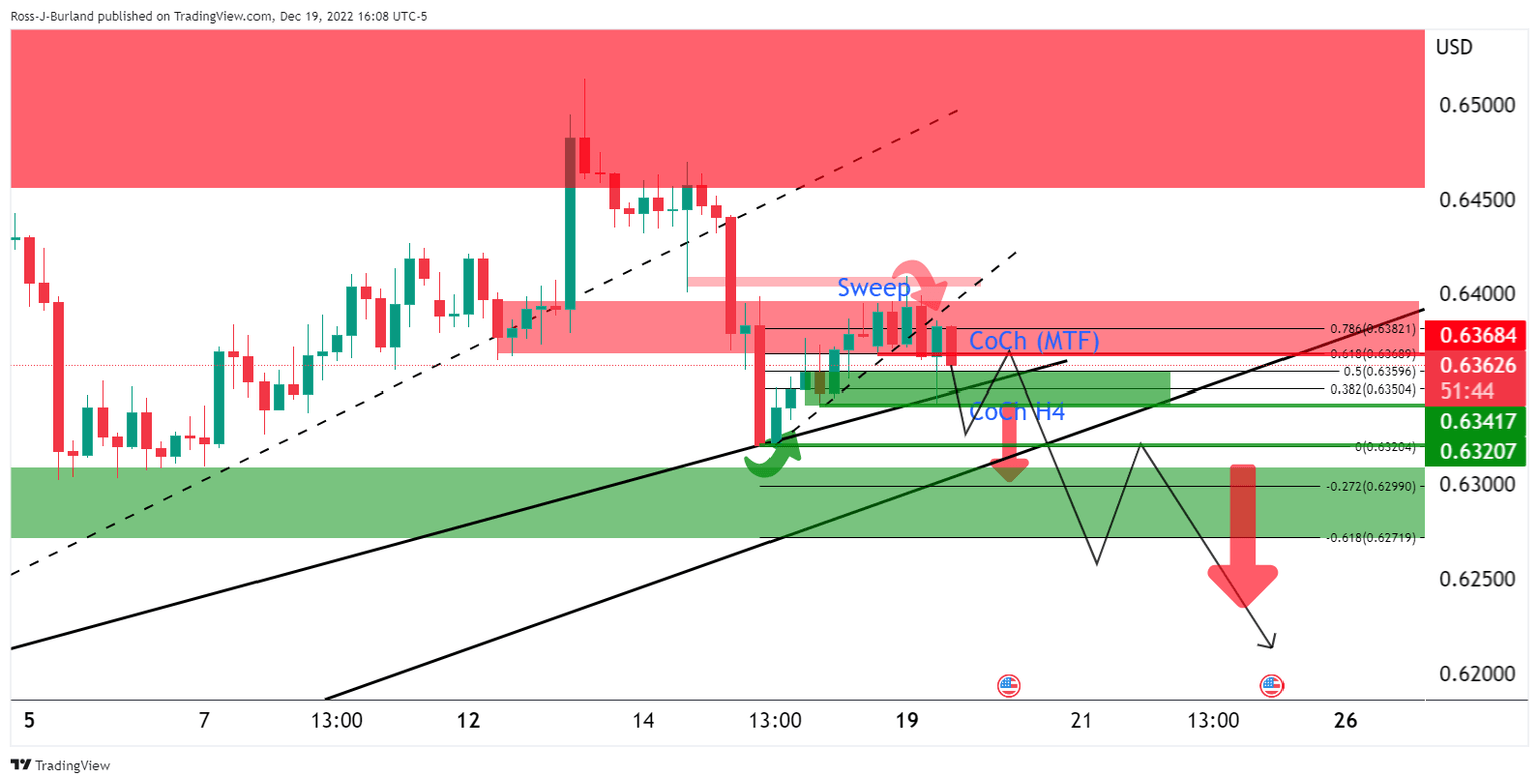 As per the prior analysis, NZD/USD Price Analysis: Bulls move in from critical support, bears eye an opportunity, and NZD/USD bulls move in at the start of the week but bears are lurking, where it was stated that the bulls have moved in and this was giving the bears an opportunity for a discount, the bears have indeed capitalized on the sweep of liquidity to 0.6400.