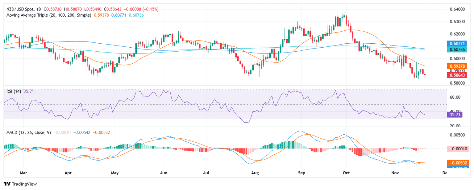 The NZD/USD pair declined by 0.26% to 0.5865 on Thursday, continuing its downward trend. The pair has resumed its losses and is currently trading near lows not seen since April, as bears maintain control.