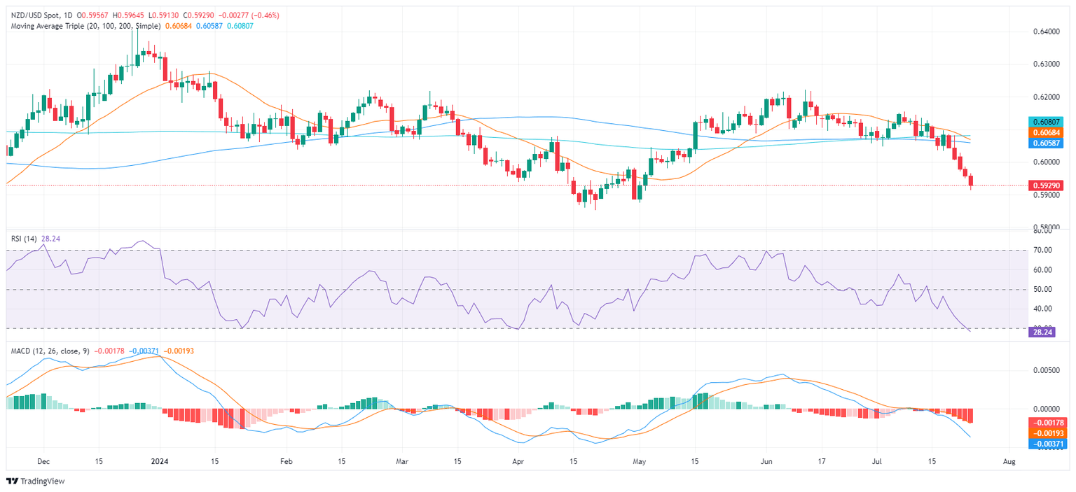 - NZD/USD deepens losses, slipping near the 0.5900 mark, marking a consistent bearish trend since last week.