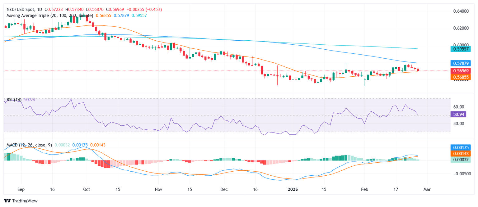 The NZD/USD pair continued its decline on Wednesday slightly below 0.5700, marking its fourth consecutive daily loss as sellers remained in control. The pair has now erased the majority of last week’s gains and is approaching a key technical threshold, the 20-day Simple Moving Average (SMA), which could determine the next directional move.