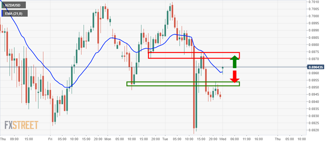 The price of the kiwi is sat between hourly support at 0.6950 and resistance 0.6970/90 ahead of the RBNZ with bulls creating a W-formation from which the consensus could well be on the downside in due course.