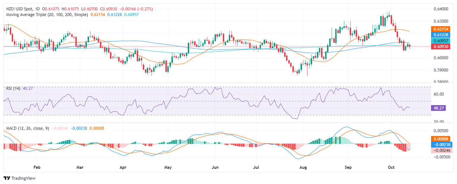 In Monday's session, the NZD/USD pair extended its recent decline, falling by 0.30% to 0.6095. The technical indicators are also bearish, suggesting that the selling pressure is likely to continue if the buyers fail to sustain the 0.6100 area where the 200-day Simple Moving Average (SMA) converges.