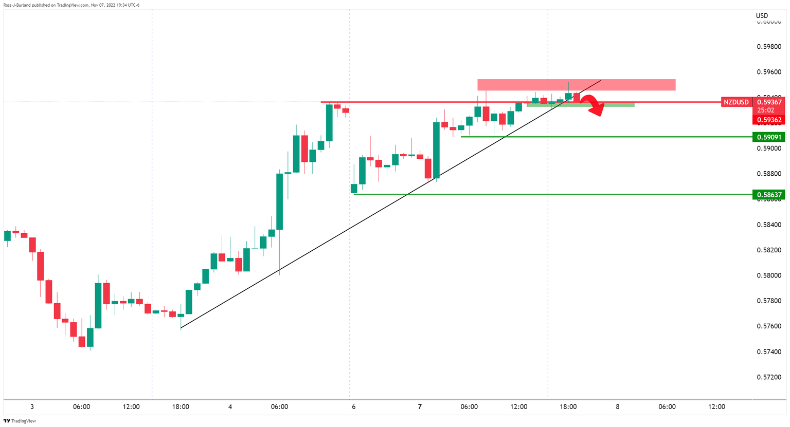 A Federal Reserve pivot could be on the cards that would give relief to global stock markets and currencies, such as the Kiwi, that tend to track the performance of equities. Consequently, US yields are weak at the start of the week as the following technical analysis will show and NZDUSD is gathering pace on the bid into last weeks and the overnight highs: