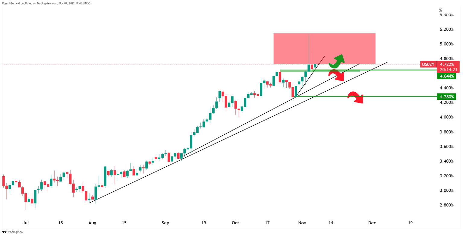 Meanwhile, US yields are at a crossroads and should they give out below the micro trendline, there is a risk that a significant move lower below the key daily structures would derail the US dollar, lending huge support to stocks and currencies such s the Kiwi.