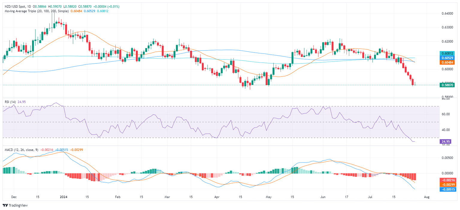 - NZD/USD slightly rebounds, hovering near the 0.5900 mark, but remains under a clear bearish influence.