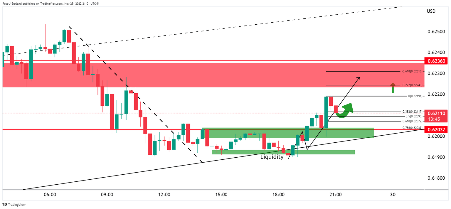 If the support in the Fibonacci scale holds, then there will be prospects of a bullish continuation to find liquidity on the other side of the range as illustrated above. 0.6250 is eyed on a break of the resistance near 0.6225.