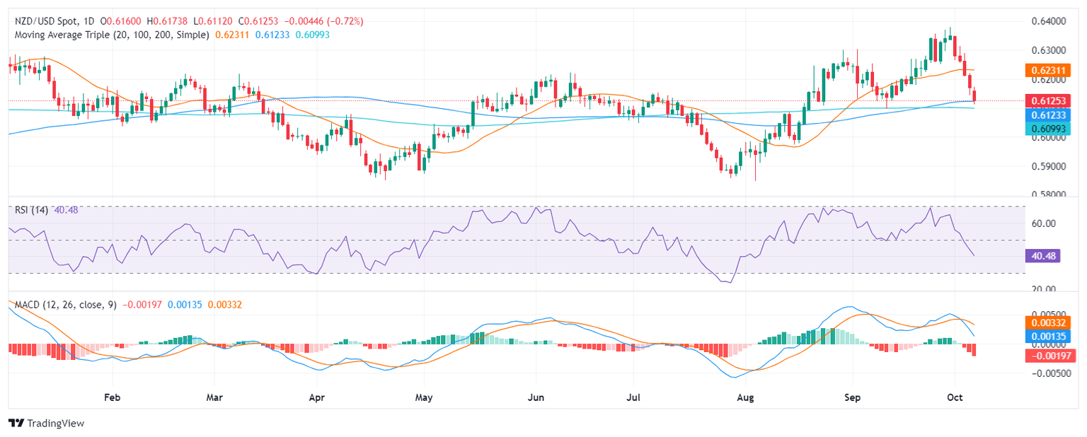 - The NZD/USD declined by 0.60% to 0.6125, extending its recent downtrend.