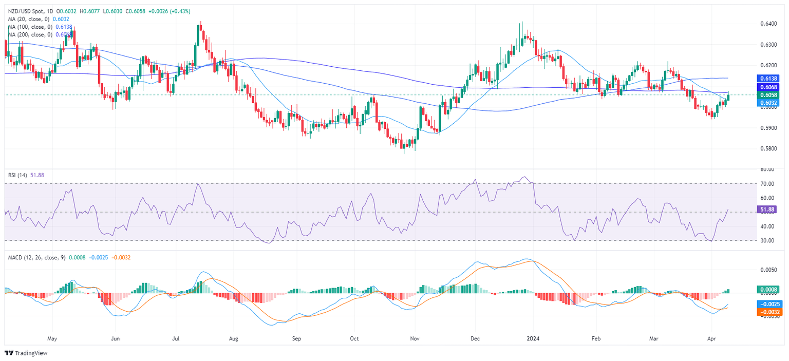 The NZD/USD rose to around 0.6058, reflecting a 0.41% gain on Tuesday's session. Despite the pair experiencing a momentum shift from bearish to bullish, it is positioned beneath key Simple Moving Averages (SMAs), hinting at a possible extended downtrend.