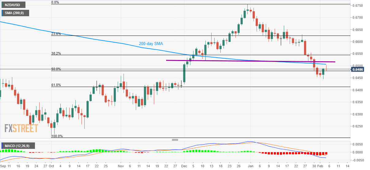 NZD/USD trades modestly changed near 0.6490 during early Wednesday. The pair recently took clues from China’s Caixin Services PMI while stepping back from Tuesday’s run-up. As a result, 200-day SMA continues to act as the immediate key resistance.