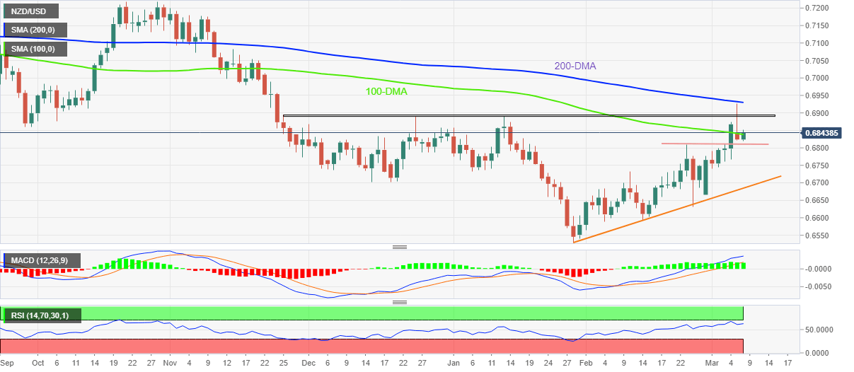 It’s worth noting that the MACD and RSI conditions are better for the NZD/USD bulls to extend the latest break of the 100-DMA towards a horizontal area comprising multiple tops marked since late November 2021 around 0.6900.