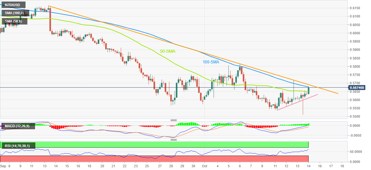 It’s worth noting that the Kiwi pair’s successful break of the 50-SMA joins bullish MACD signals and firmer RSI (14), not overbought, to keep buyers hopeful.