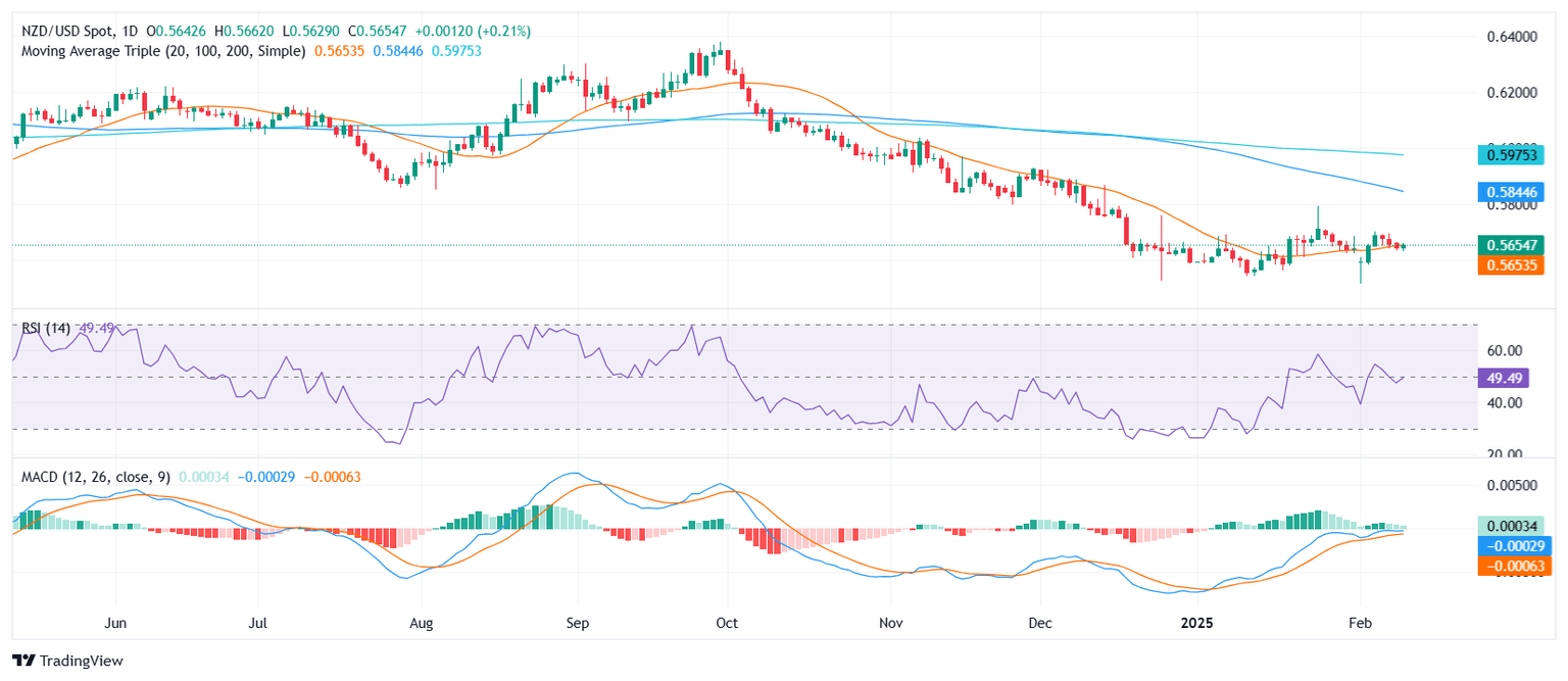 NZD/USD advanced on Tuesday, rising 0.31% to trade at 0.5655 as bulls attempted to regain control. The pair is currently testing the 20-day Simple Moving Average (SMA) at 0.5650, a level that has acted as a key resistance zone. A sustained hold above this mark could improve the near-term outlook, while failure to maintain upward pressure may leave the pair vulnerable to renewed selling.