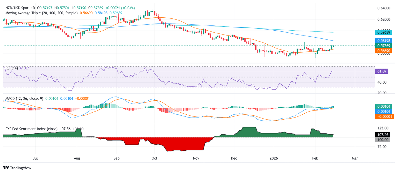 The NZD/USD pair continued its upward momentum on Monday, gaining 0.26% to reach 0.5735, marking its highest level since late January. The pair has now accumulated a 1.50% advance over the past week, with bulls showing no signs of letting up. The next key test lies ahead at the 100-day Simple Moving Average (SMA), positioned at 0.5825, a level that could determine whether the rally extends further.