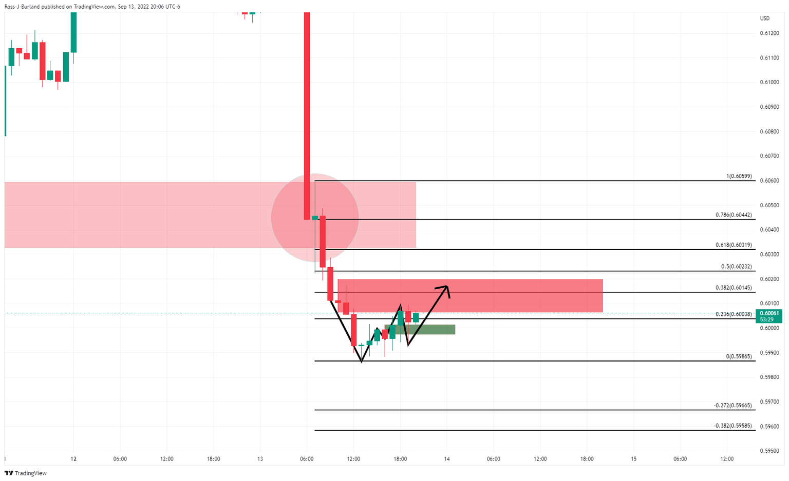 The price moved up from the expected support level in a grind higher until the key US inflation data hit the screens. However, the pair is now decelerating, correcting into what could become resistance for the day ahead: