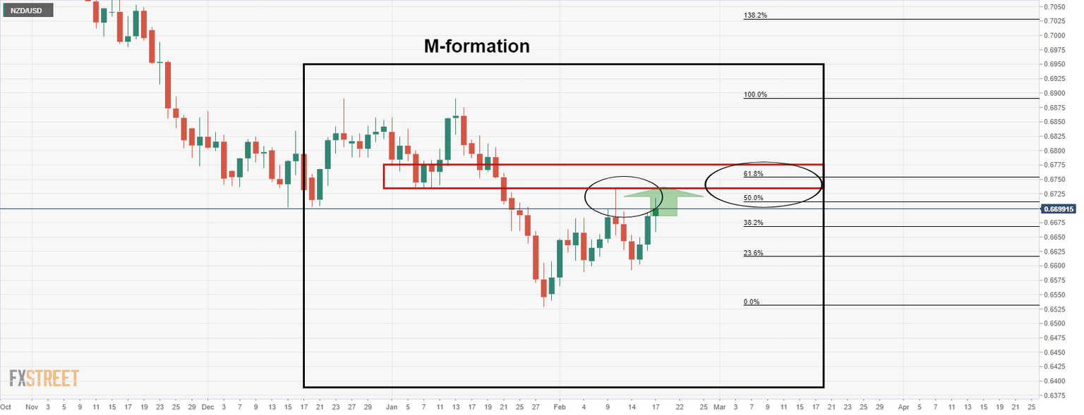 As per the prior analysis, NZD/USD flying towards 0.67 the figure despite Russia angst, the bird crept higher for a deeper test of the M-formation's neckline.