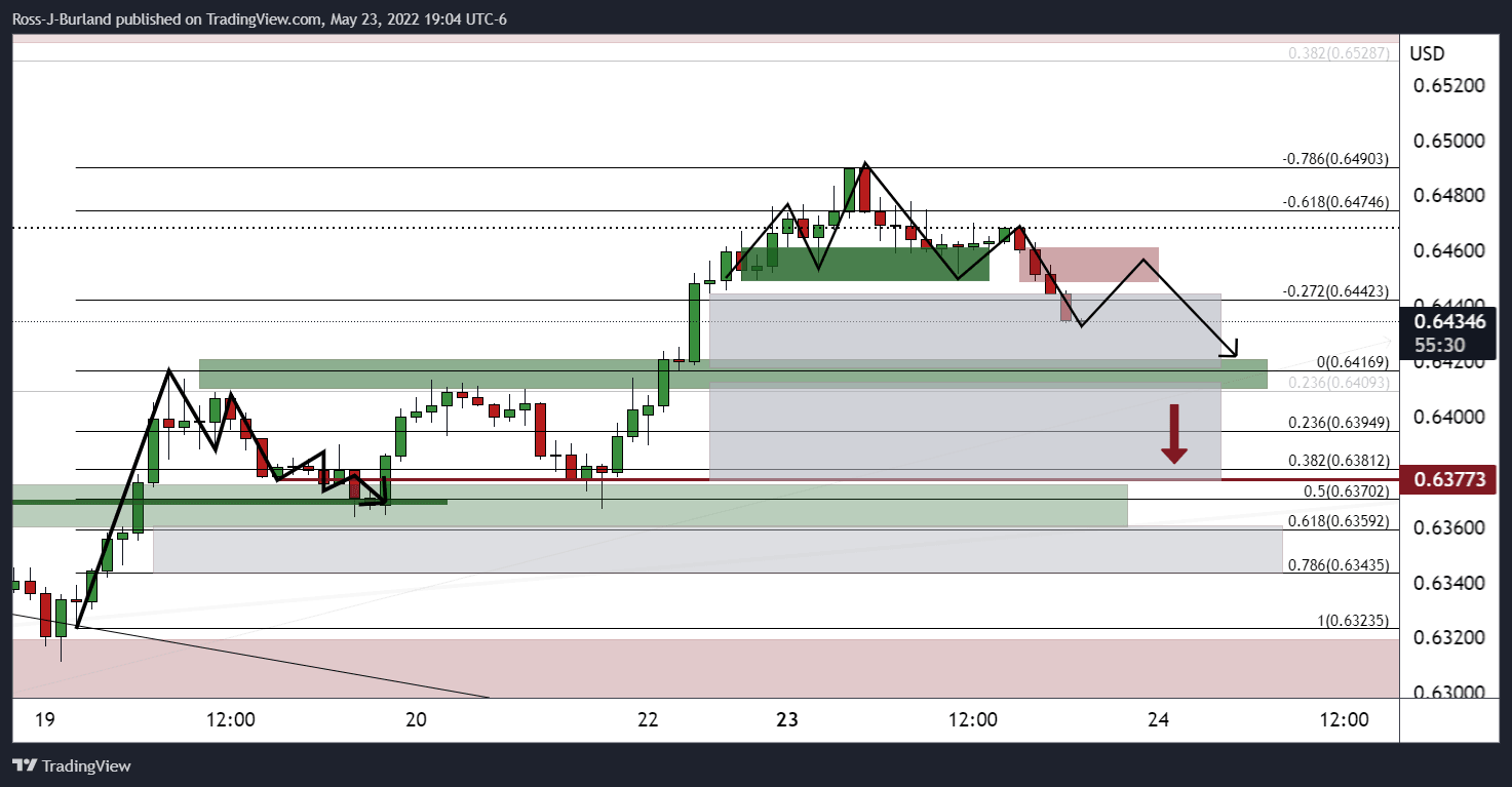 The M-formation's neckline has offered resistance and the bears are taking over with the old resistance eyed to the aforementioned 0.6416 area.