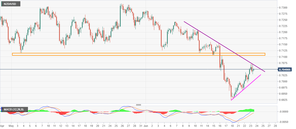 NZD/USD eases to 0.7042, following a pullback from a fortnight-old resistance, amid early Thursday. Even so, the kiwi bears remain unconvinced as MACD flashes bullish signals and the prices are well beyond the weekly support line.