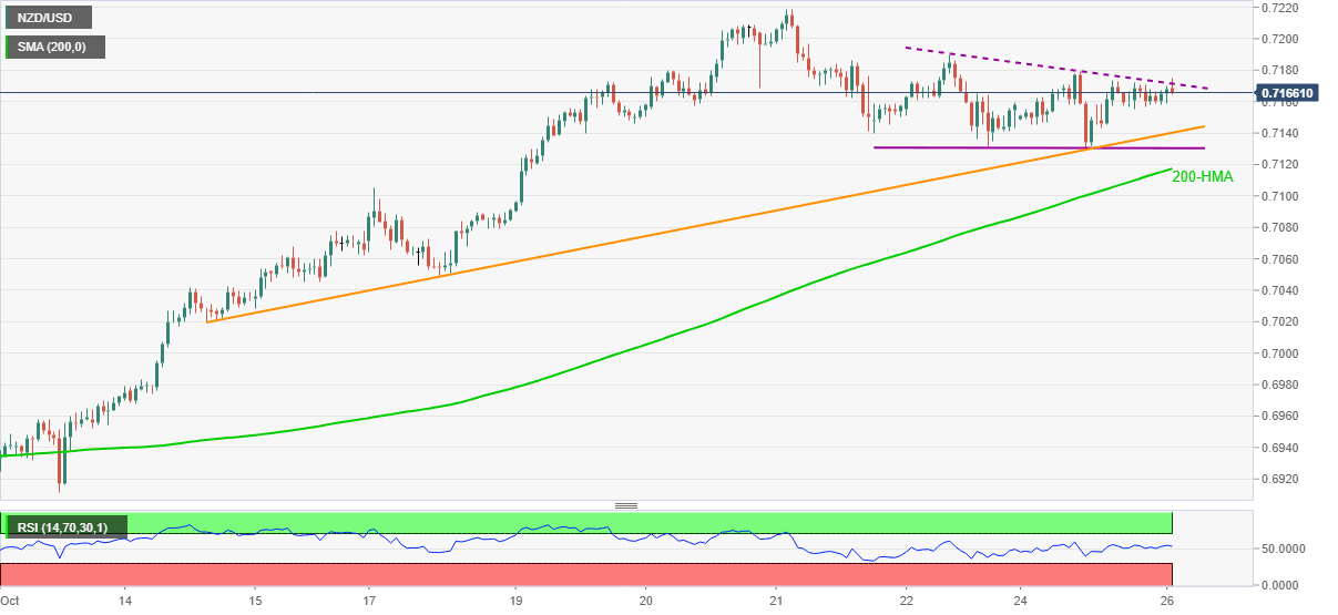 NZD/USD pokes resistance line of a two-day-old descending triangle around 0.7170, up 0.15% intraday, during early Tuesday.