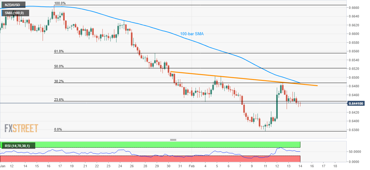 NZD/USD declines to 0.6440 during the early Asian session on Friday. The pair recently slipped below 23.6% Fibonacci retracement of January 16 to February 11 declines.