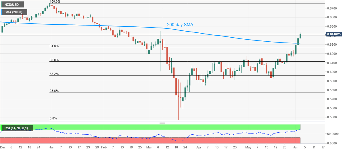 NZD/USD recedes from the March month top to 0.6415 but remains 0.77% up on a day, even after China’s Caixin Services PMI rose in May. The data published during early Wednesday suggest a hike to 55.00 versus 50.3 previous readouts.