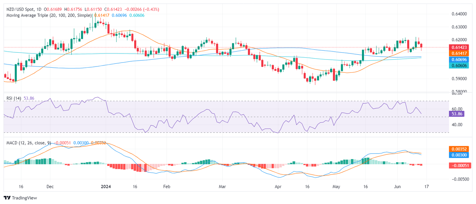 The NZD/USD dipped to a low of 0.6115 before recovering and stabilizing at the 20-day Simple Moving Average (SMA) of 0.6140. Both bulls and bears seem locked in an intense tussle with attempts to breach the 0.6220 area and the 20-day SMA respectively proving unsuccessful. This is indicative of an ongoing consolidation phase in the aftermath of Mid-May's sharp increase which saw the pair rise by more than 1.30%.